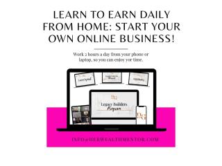 Learn how to earn $900 per day online working around your family! Step by step training is included. Plus free live mentoring to show you how you can reach your income goals this year! Must have a cell phone, laptop or computer Must have at least 2 h...