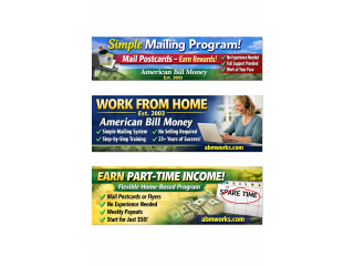 American Bill Money is a home-based program established in 2003 that provides a simple, step-by-step system using postcards, flyers, or drop cards.