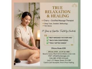 Relax & Heal with Expert Deep Tissue & Swedish Massage in London E14Health - Beauty - Fitness - - November 6, 2025 Check with sellerExperience true relaxation and healing with Cherry, acertified Asian British massage therapist offering 17 years of professional experience in multiple therapeutic techniques. Cherry specializes indeep tissue massage,Swedish massage,reflexology, andh...